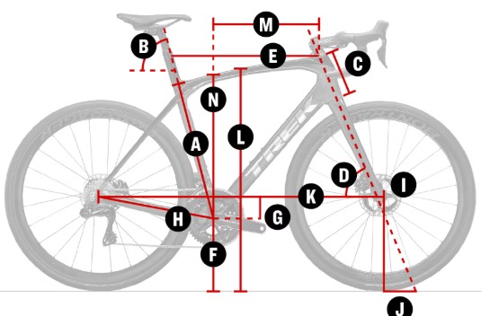 N° de taille | Diamètre roues | A — Tube de selle | B — Angle tube de selle | C — Douille de direction | D — Angle direction | E — Top tube efficient | G — Chute pédalier | H — Chaîne | I — Compensation | J — Trail | K — Empattement | L — Surplomb | M — Portée cadre | N — Hauteur tube direction | Hauteur min. rail (petit mât) | Hauteur max. rail (petit mât) | Hauteur min. rail (grand mât) | Hauteur max. rail (grand mât) |